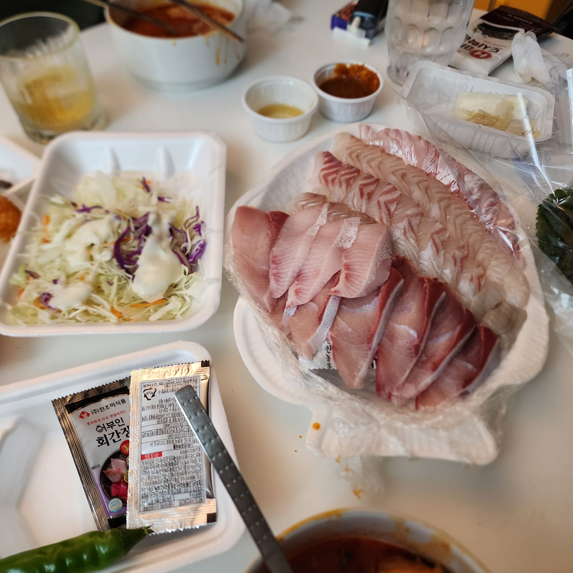 친구의 자취방 근처에서 사우나도 가고! 밥도 묵고! 다했어!를 시전, 저녁의 술안주는 닭도리탕과 방어회였다.